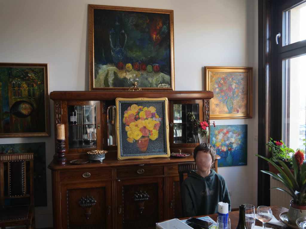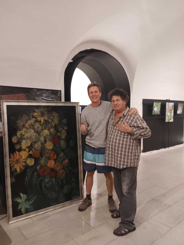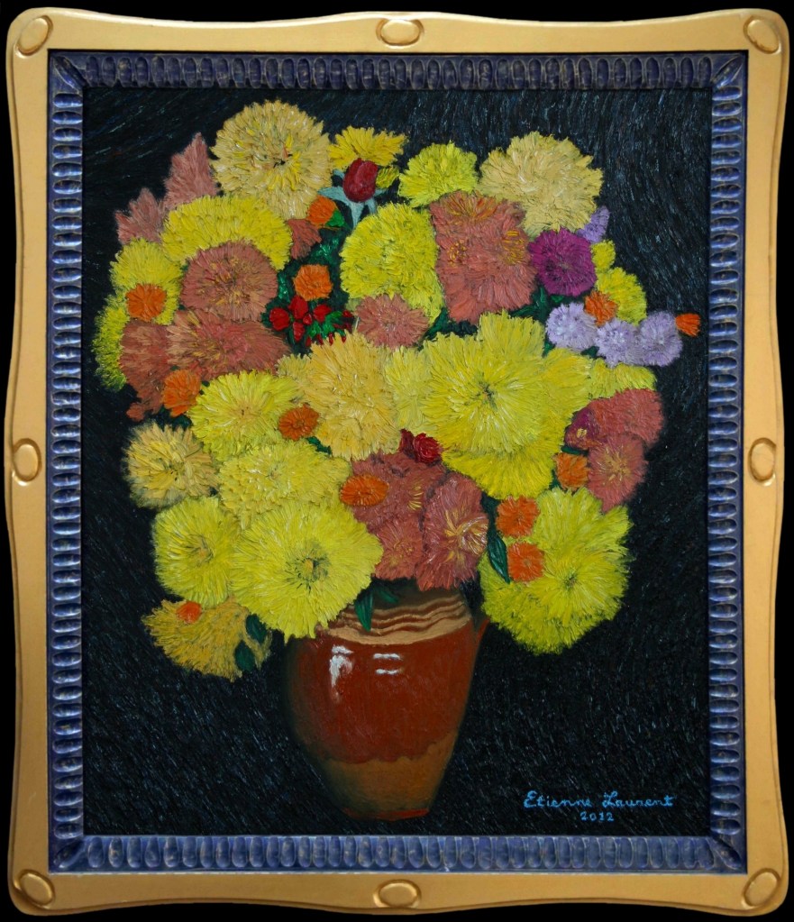 Création du tableau en 2012. Je passe l’hiver 2012-2013 dans un village à côté de Timisoara en Roumanie.Avec le menuisier du village, nous construisons un cadre pour le tableau. Il est ensuite exposé dans une boutique de tableaux qui se trouve être en face d’une galerie qui expose les tableaux d’un peintre de Timisoara, Mihai Teodor Olteanu.Ce peintre, je le rencontre par hasard en 2024 lors d’un séjour à Timisoara. Il m’invite chez lui.Je lui prête mes chrysanthèmes. Le jaune est sa couleur préférée.L’année suivante, mon tableau apparait discrètement sur une affiche du peintre.Finalement je décide de donner le tableau au menuisier qui m’avait aidé à faire mes cadres en 2013.