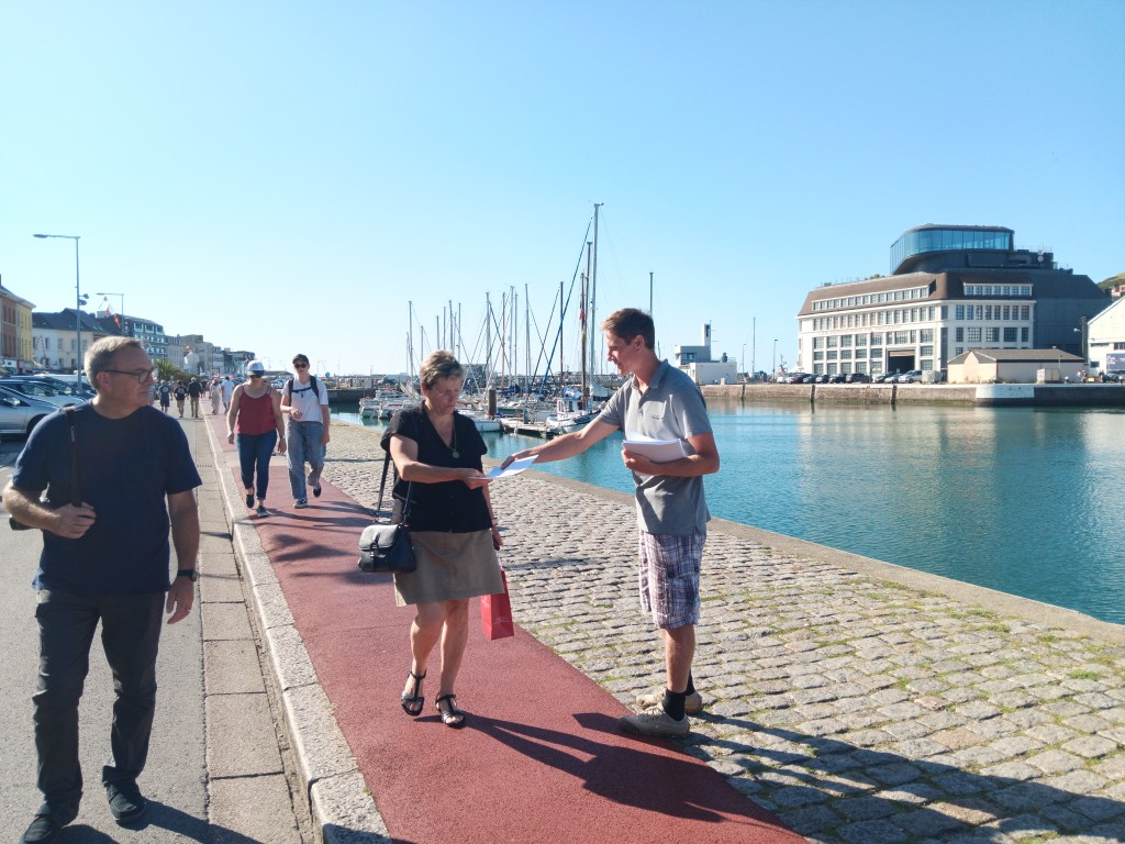 Three girls of about 25 and 15 years old pass by and I recognize them. I ask them if they took the sheet and they tell me no, and still don’t take it. A man in his sixties parks his car, gets out and comes towards me. I say to him « have you come all the way around Normandy to come and get my sheet? » He takes my sheet and answers me: « yes indeed I just came from St Vaast la Hougue » He did indeed come from the other end of Normandy!