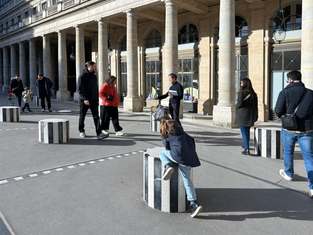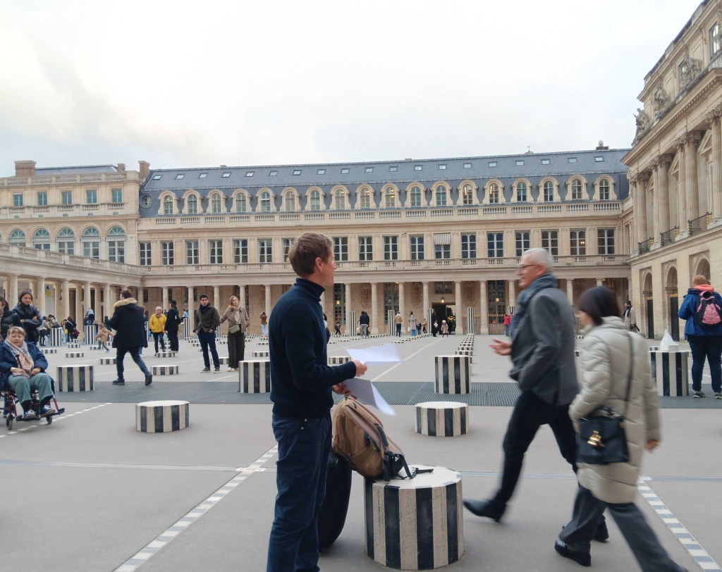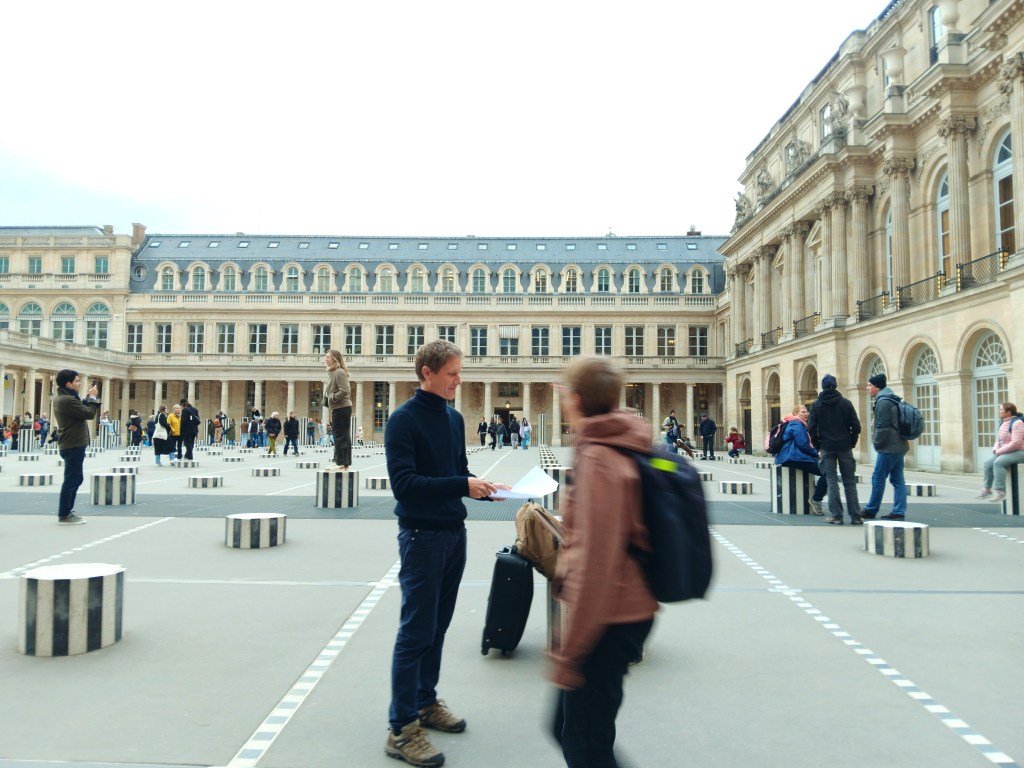 L’employé chargé de la surveillance du site est venu nous voir… et bonne surprise il affirme que puisqu’il s’agit de papier blanc et qu’il n’y a pas de visées commerciales il nous autorise à continuer ! Il nous raconte son expérience du monument de Daniel Buren, témoin particulier des nombreuses glissades sur les marbres noirs des bords aiguës des colonnes qui ont parfois occasionnées des traumatismes crâniens. Il y est particulièrement sensible car il a été lui-même victime d’un accident dans sa jeunesse. Pourtant son amour pour cet environnement est palpable, il ne peut s’empêcher de nous expliquer des détails compliqués sur les rapports entre l’installation pérenne et les bâtiment du Palais Royal qui l’entoure. Il se rappelle de cet endroit quand ce n’était qu’un parking privé pour le Conseil Constitutionnel. Il évoque les discrètes visites de Buren sur son œuvre préférée. Ce lieu lui était prédestiné en raison de la présence des stores rayés rouges et blancs déjà présents au dessus des fenêtres du Palais avant 1985 (information à confirmer).